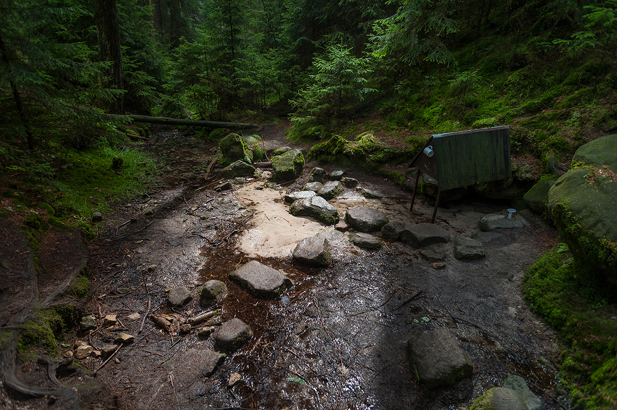 Rozdroże szlaków turystycznych pod Wykałaczką Karkonosza (Krakonošovo párátko). Tutaj skręca w lewo zielony szlak prowadzący do Janovic. Możemy nim przejść pół kilometra, by później skręcić w prawo i niebieskim szlakiem przejść przez Rozpadliny (Rokliny) nad Anenską Doliną (Anenské údolí) do Wilczego Wąwozu (Vlčí rokle).